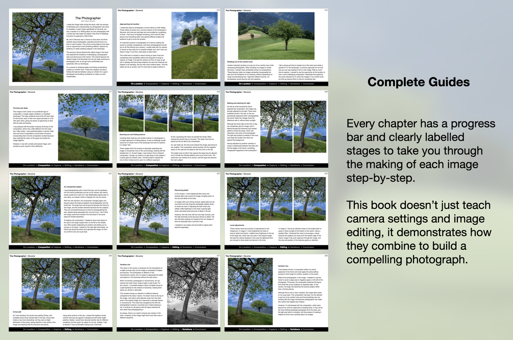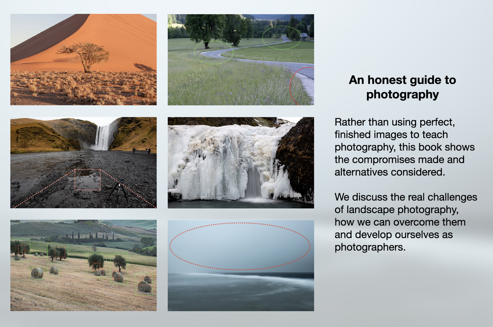This book doesn’t present an idealised view of flawless photography. It examines the ideas which go into a composition, the compromises made and alternatives considered, the experiments and failed attempts. It's about what landscape photography is really like, and teaches how to question our decisions and understand the options available so that we can each build our own style of photography.